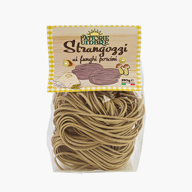 Gli Strangozzi al Fungo Porcino sono strangozzi al cui impasto di farina, uova e sale si aggiungono funghi porcini disidratati. L’impasto viene tirato a sfoglia e infine tagliato, mantenendo intatte le scaglie di fungo porcino che conferiscono allo strangozzo un sapore aromatico e gradevole. Perfetto per preparare in modo semplice e veloce un piatto appetitoso gradito anche ai bambini. Conservatene una confezione in dispensa per poter cucinare velocemente una pasta appetitosa in caso di ospiti improvvisi!