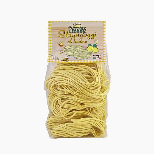 Prodotto Agroalimentare tipico dell'Umbria ma diffuso anche in tutto il centro Italia, gli Strangozzi nascono come un prodotto "povero" della tradizione contadina dell'epoca. Pasta lunga, dalla sezione quadrata o rettangolare, viene prodotta dalla semplice unione di farina di grano tenero ed acqua, con l'eventuale aggiunta del sale. Il curioso nome è da ricondurre poi, secondo la tradizione, alla somiglianza con le stringhe delle scarpe di epoca pontificia attraverso le quali i briganti compivano numerosi agguati ai rappresentanti Clericali (da qui le varianti "strozzapreti" o "strangolapreti"). Gli Strangozzi al limone si contraddistinguono per il sapore fresco, ideale per creare primi sorprendenti. Usateli, ad esempio, in abbinamento a delle zucchine e gamberetti, oppure gustateli al naturale, con la semplice aggiunta di burro fuso e formaggio a piacere.